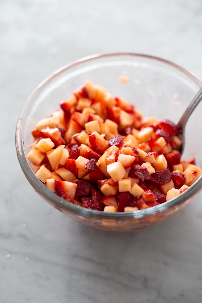 - In a large mixing bowl combine the diced apples and sliced strawberries. Toss with lemon juice, brown sugar, and corn starch.