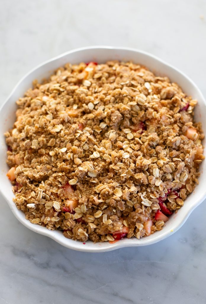 - Unlike a standard strawberry crumble recipe, the apples create an extra thick filling so it isn’t as watery. (I usually need taopica to thicken berry recipes but the apple helps counter the juiciness!)